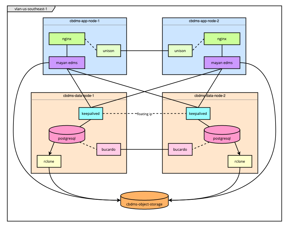 • Mayan stores things like configuration, users, and other data within the PostgreSQL databases. Its connection to these databases occurs via a floating URL on the VLAN (in this tutorial, 10.8.0.100). The floating URL is maintained by keepalived configured for failover.
